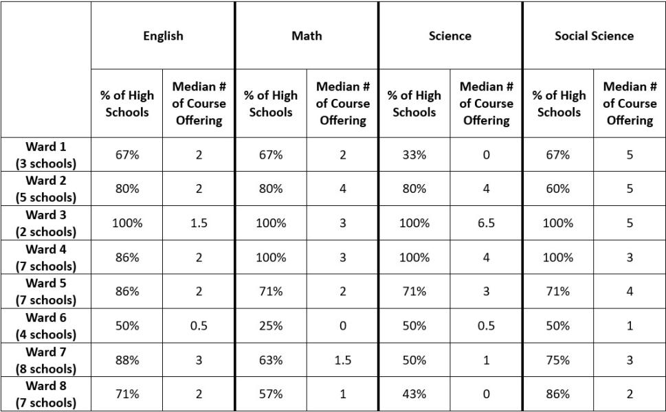 Table 3. The Percentage of High Schools Offering Specialized Courses and the Median Number of Course Offerings of Any Type, by Academic Subject Area and Ward.
